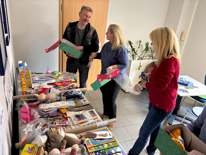 Auch in diesem Jahr haben wir uns wieder an der Aktion „Weihnachten im Schuhkarton“ von Samaritan's Purse beteiligt und unsere Kolleginnen und Kollegen haben gemeinsam 15 Geschenkpakete gepackt – für unterschiedliche Altersgruppen und jeweils für Jungen und Mädchen. Mit dabei: Spielsachen, Schulmaterial, Hygieneartikel, kleine Überraschungen und viele handgeschriebene Grüße.